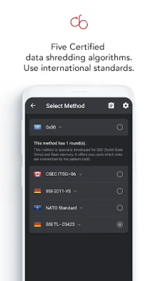 CB Innovations android data eraser app is made in Germany. The secure eraser app comes with secure erasing methods such as the NATO (North Atlantic Treaty Organization) standard, the German BSI-2011- VS & German BSI TL-03423 as well as the Canadian CSEC ITSG-06!
