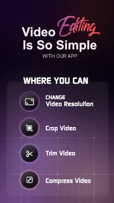 This app is made to help your edit your videos quickly with simple quick functions like trim video, compress video, crop video or resize video dimensions.